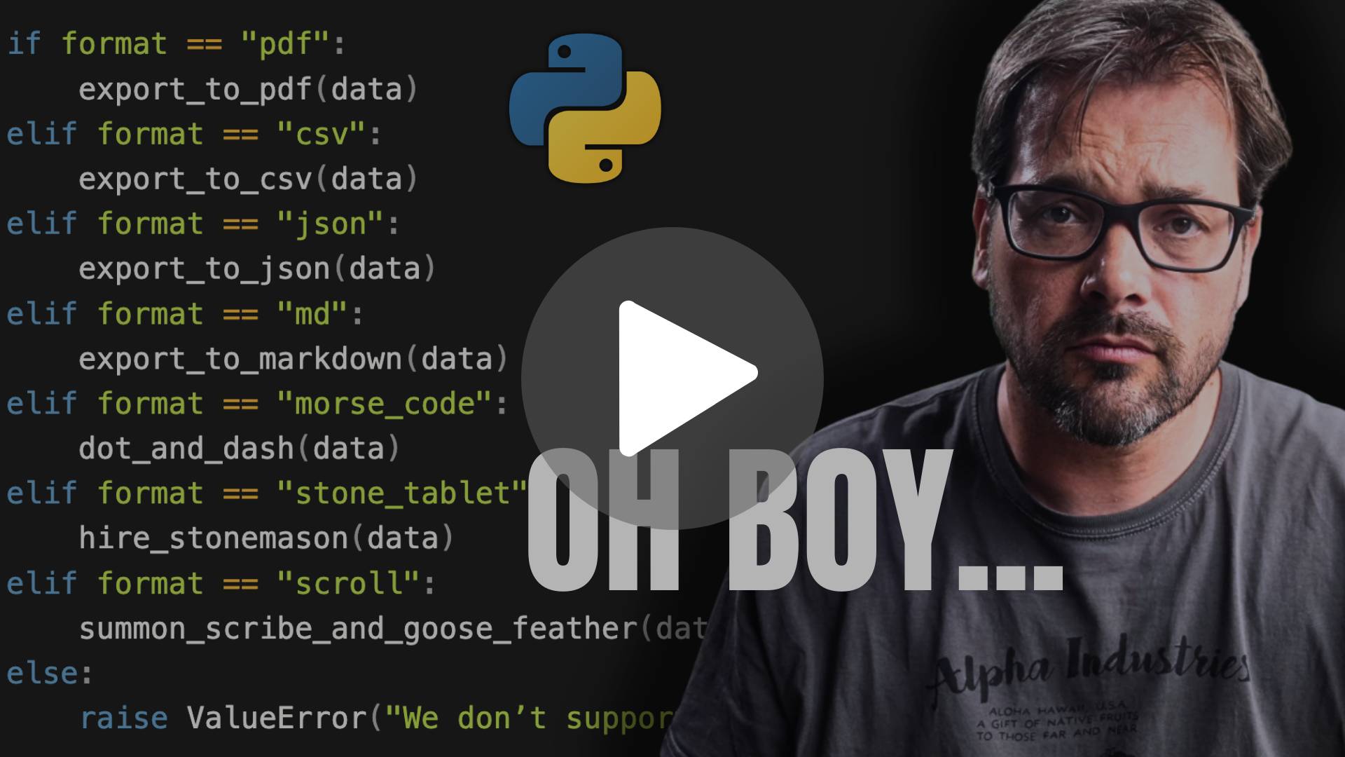 Hi there, When I see an if-statement with multiple elifs in my code, it almost always triggers an investigation. Is there some way to rewrite this to make the logic simpler? Is there a chance that in the future I'll need to add even more complexity? If so, I'll try to redesign the code so that I don't need that chain of if-elif statements. In this week’s video, I cover a design pattern that helped me eliminate many of those chains from a project + at the same time made the code easier to...