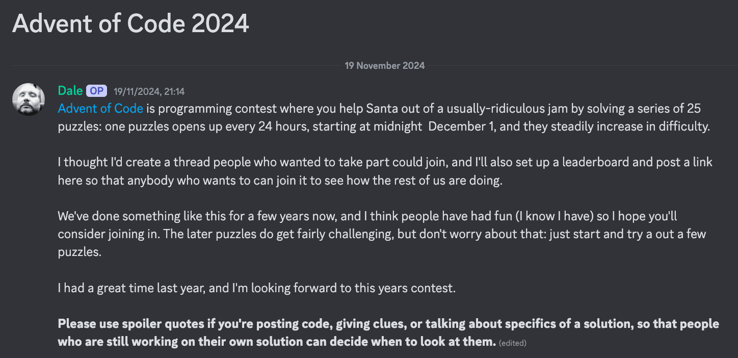 On our Discord server, Dale has kicked off a thread where you can join in, discuss solutions, and cheer each other on. There’s even a leaderboard to track everyone’s progress.